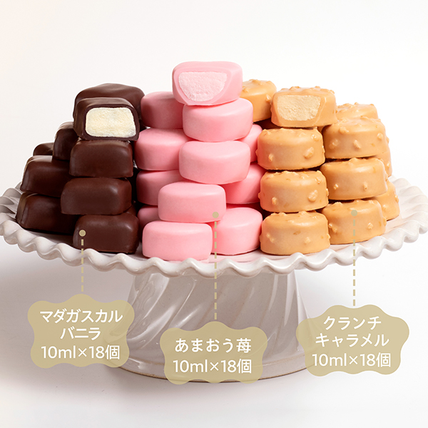サイズ:【マダガスカルバニラ】10ml×18個・【クランチキャラメル】10ml×18個・【あまおう苺】10ml×18個