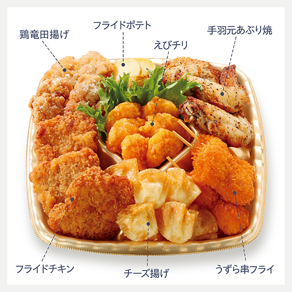 フライドチキン・手羽元あぶり焼・えびチリ・鶏竜田揚げ・うずら串フライ・チーズ揚げ・フライドポテト