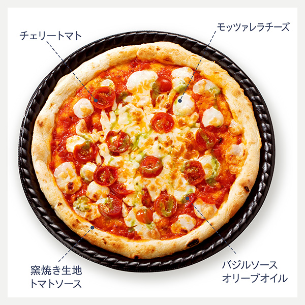 窯焼き生地、トマトソース、モッツァレラチーズ、チェリートマト、バジルソース、オリーブオイル