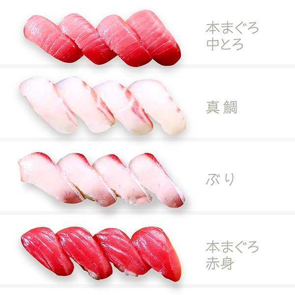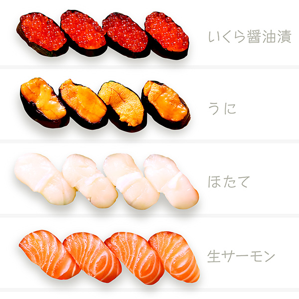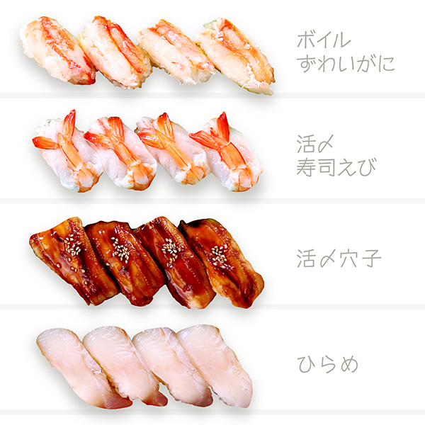本まぐろ中とろ・真鯛・ぶり・本まぐろ赤身・いくら醤油漬・うに・ほたて・生サーモン・ボイルずわいがに・活〆寿司えび・活〆穴子・ひらめ