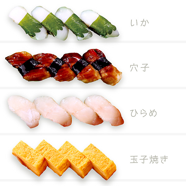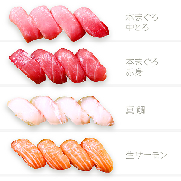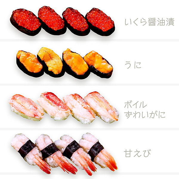 本まぐろ中とろ・本まぐろ赤身・真鯛・生サーモン・いくら醤油・うに・ボイルずわいかに・甘えび・いか・穴子・ひらめ・玉子焼き