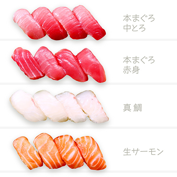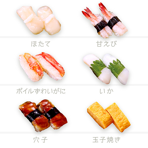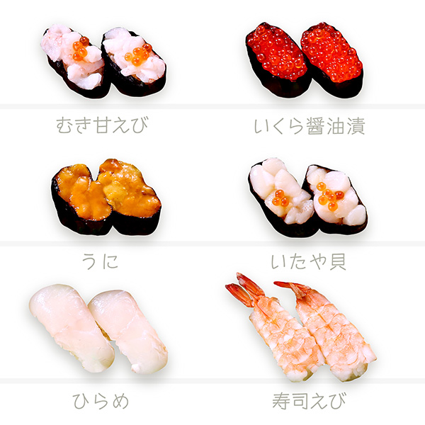 本まぐろ中とろ・本まぐろ赤身・真鯛・生サーモン・むき甘えび・いくら醤油漬・うに・いたや貝・ひらめ・寿司えび・ほたて・甘えび・ボイルずわいかに・いか・穴子・玉子焼き