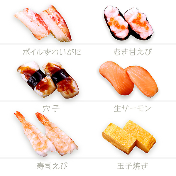本まぐろ中とろ・いか・本まぐろ赤身・真鯛・いくら醤油漬・ほたて・ルずわいがに・むき甘えび・穴子・生サーモン・寿司えび・玉子焼き