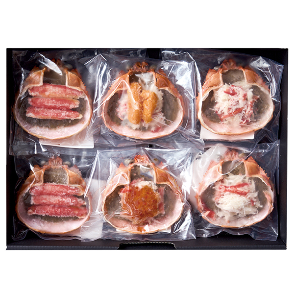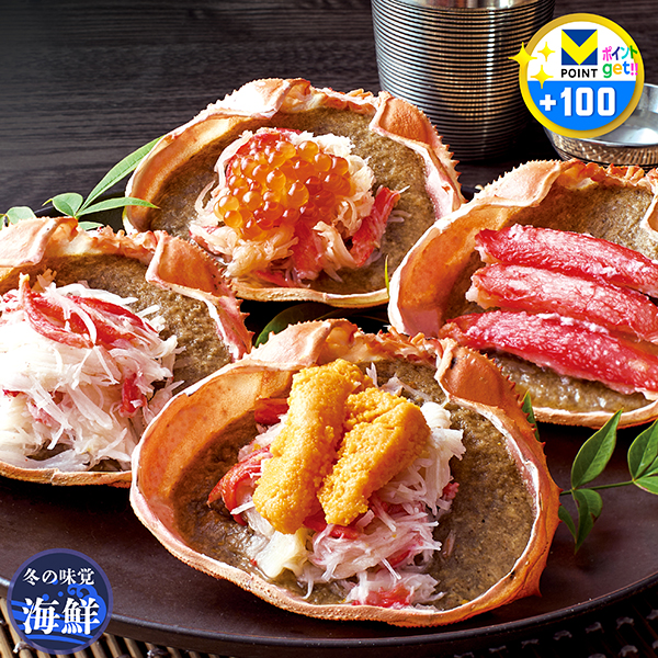 かにみそ甲羅盛り(かに脚肉のせ2個、かにほぐし身のせ2個、かにほぐし身・いくらのせ1個、かにほぐし身・うにのせ1個) 計6個