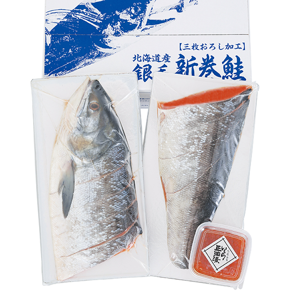 銀毛新巻鮭 姿半身600g(二分割)、北海道産いくら醤油漬60g