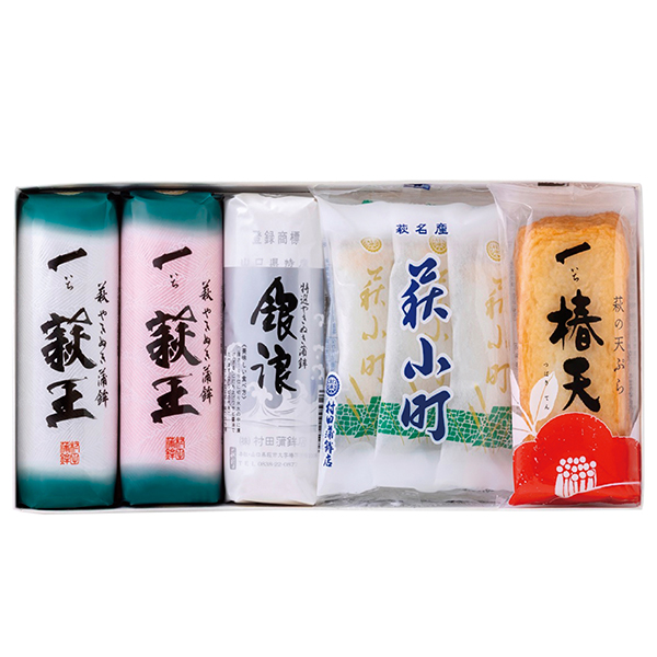 一萩王かまぼこ大(白・紅)各160g×1、銀浪かまぼこ大(白)160g×1、萩小町ちくわ3本入×1、一椿天3枚入×1