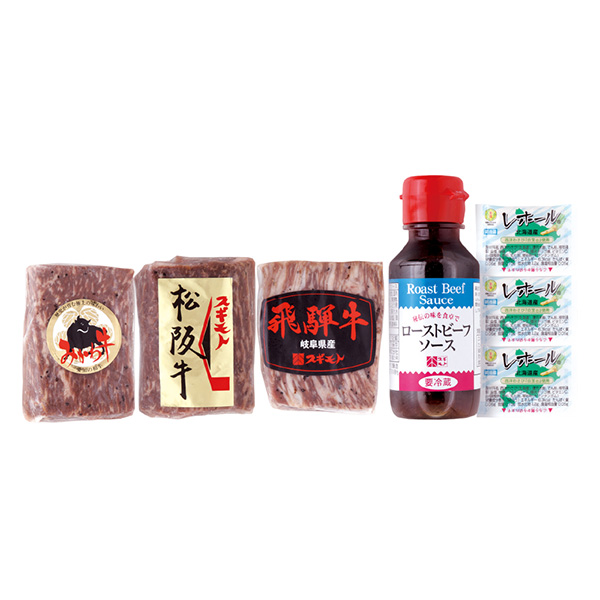 松阪牛モモローストビーフ・飛騨牛モモローストビーフ・みかわ牛モモローストビーフ 各100g×1、ローストビーフソース100ml×1、レホール3g×3