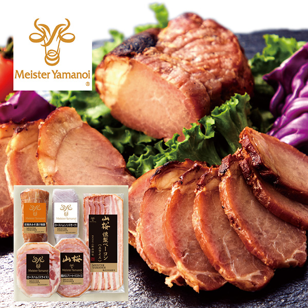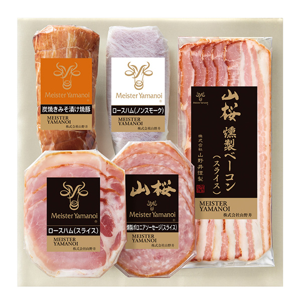 炭焼きみそ漬け焼豚170g、ロースハム(ノンスモーク)70g、ロースハム(スライス)40g、山桜燻製ボロニアソーセージ(スライス)40g、山桜燻製ベーコン(スライス)45g