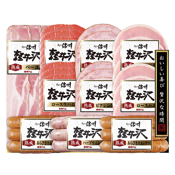 熟成ロースハムスライス42g・ロース生ハム30g・熟成あらびきウインナー58g・熟成ビアシンケン60g×各2、熟成ベーコンスライス45g・熟成ハーブウインナー58g×各1