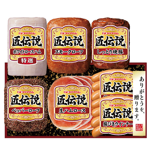 特選ホワイトロースハム180g、スモークローフ140g、しっとり焼豚160g、ペッパーローフ140g、生ハムロース32g、絹びきウインナー80g×2
