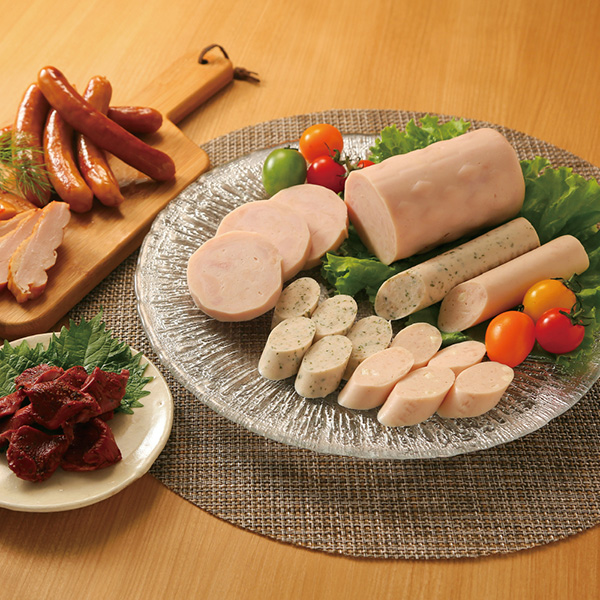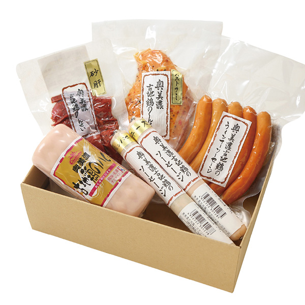 奥美濃古地鶏ハム360g、奥美濃古地鶏ウィンナー150g、奥美濃古地鶏むねパストラミ150g、奥美濃古地鶏砂肝燻製60g、奥美濃古地鶏リオナソーセージチーズ80g、奥美濃古地鶏リオナソーセージレモンパセリ80g