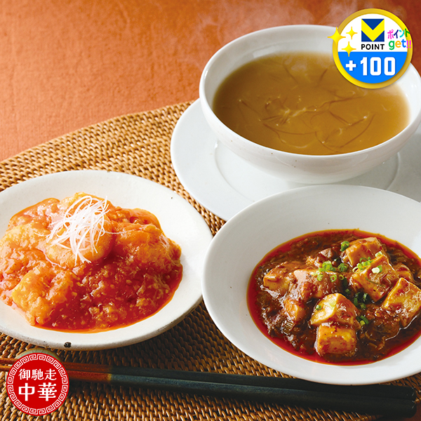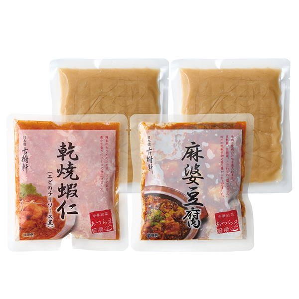 ふかひれスープ(胸びれ使用)180g×2袋、エビのチリソース煮・麻婆豆腐 各180g×1袋