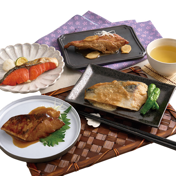 ぶりの照り焼き90g×2、さばのみそ煮90g×2、紅鮭の塩焼き60g、めぬけと黄金生姜の煮つけ100g