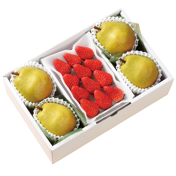 ラ・フランス4玉(1.1kg)(山形県又は青森県産)、いちご250g(福岡県又は静岡県又は愛知県産)