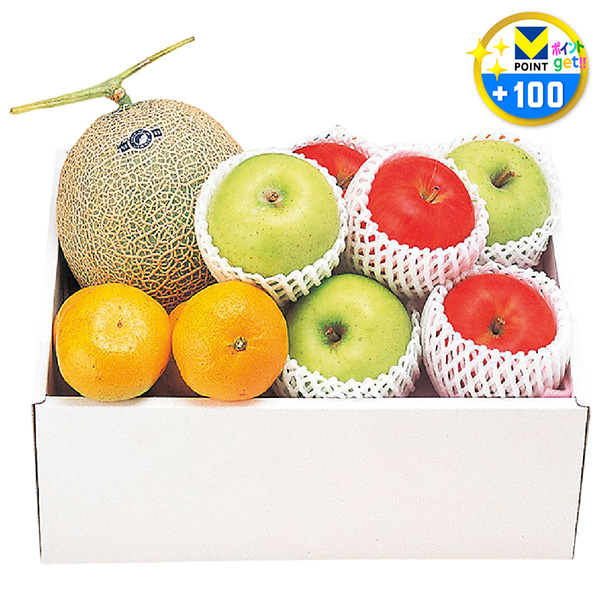 マスクメロン1.2kg×1玉(熊本県又は宮崎県産)、サンふじ・王林 各3玉(長野県又は青森県産)、みかん500g(広島県産)