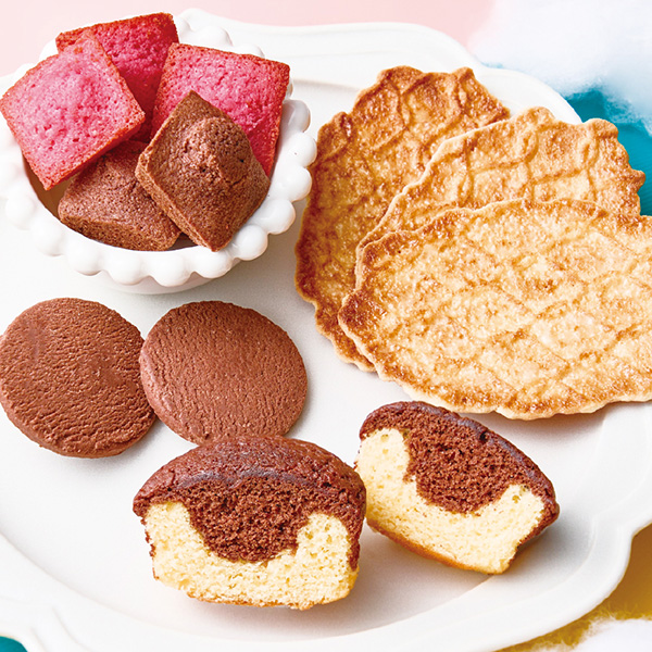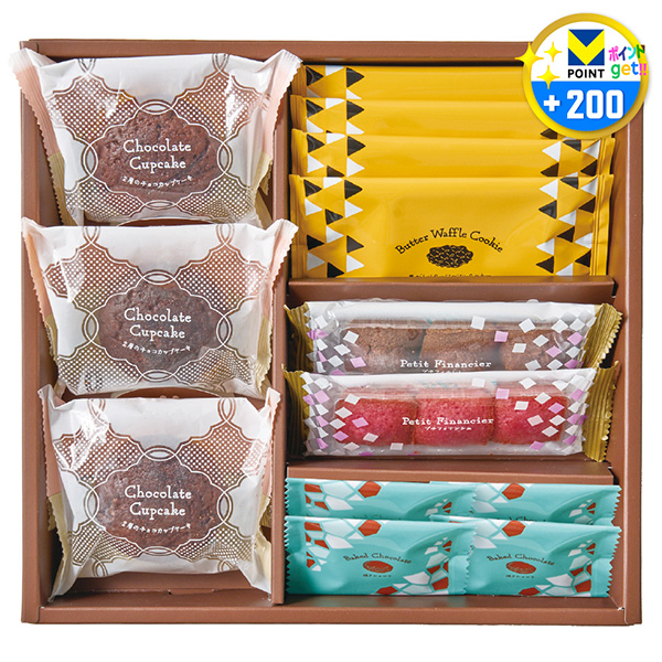 2層のチョコカップケーキ×3個、焼きショコラ×4個、焦がしバターワッフルクッキー×4枚、プチフィナンシェ(ショコラ・フランボワーズ)×各1袋(3個入)
