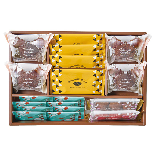 2層のチョコカップケーキ×4個、焼きショコラ×8個、焦がしバターワッフルクッキー×4枚、プチフィナンシェ(ショコラ・フランボワーズ)×各1袋(3個入)