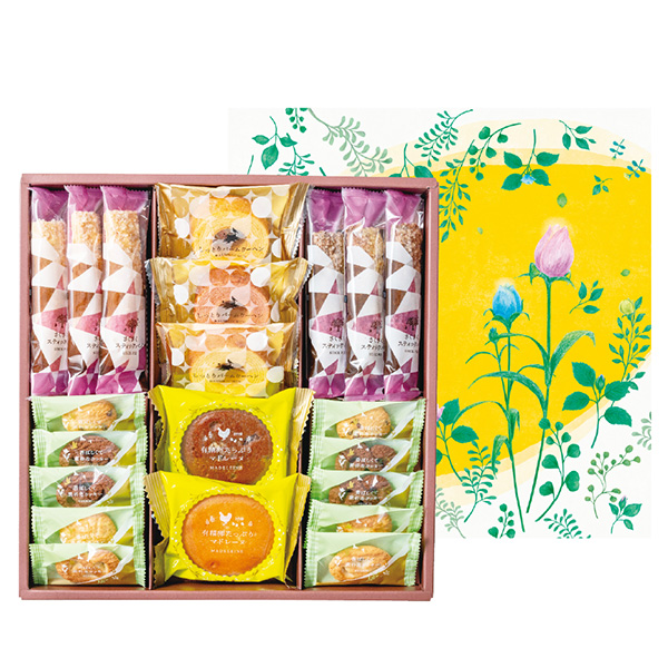 しっとりバームクーヘン×2、しっとりバームクーヘン苺×1、有精卵たっぷりマドレーヌ(プレーン・ショコラ×各1)、香ばしくて素朴なクッキー(ショコラ×4、ミルク・チョコチップ・メープル×各2)、さくさくスティックパイ(メープル・ショコラ×各3) 合計21個