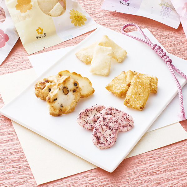 カマンベールチーズおかき・しそせんべい・はつねおかき・黒豆もち×各3袋
