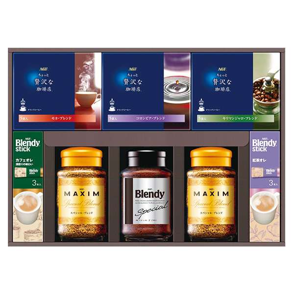 ちょっと贅沢な珈琲店ドリップコーヒー(モカブレンド・コロンビアブレンド・キリマンジャロブレンド)×各5P、マキシムインスタントコーヒースペシャルブレンド65g×2、ブレンディインスタントコーヒースペシャルテイスト70g、ブレンディスティック(カフェオレ・紅茶オレ)×各3P