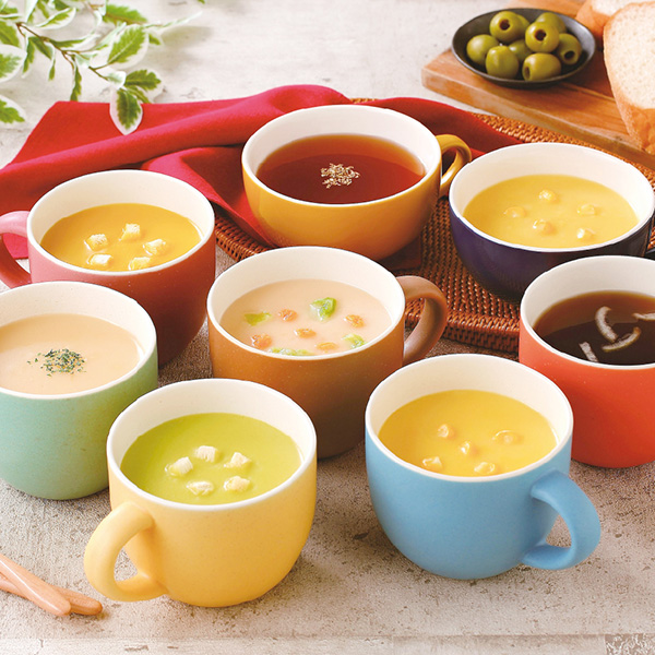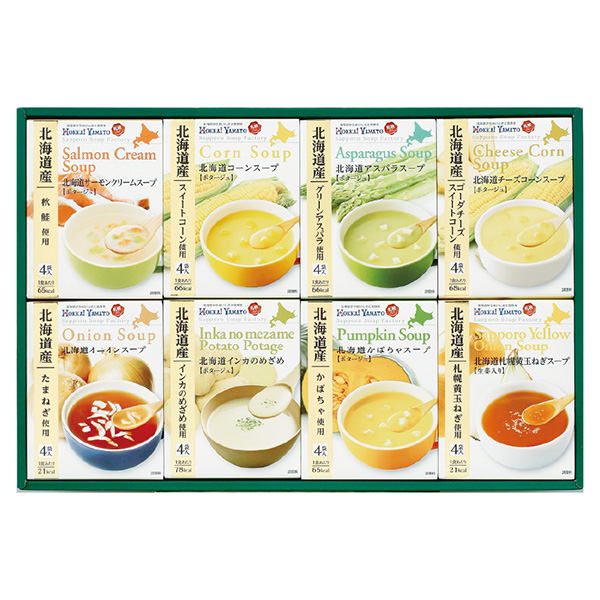 インカのめざめポタージュ20g×4袋、サーモンクリームスープ17.2g×4袋、コーンスープ・アスパラスープ・かぼちゃスープ・チーズコーンスープ 各16.5g×4袋、札幌黄玉ねぎスープ・オニオンスープ 各7g×4袋
