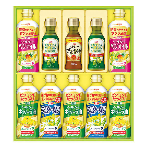 日清ヘルシーキャノーラ油350g×3、日清ヘルシーオフ・日清ヘルシーベジオイル 各350g×2、日清エキストラバージンオリーブオイル145g×2、日清ヘルシーごま香油145g×1