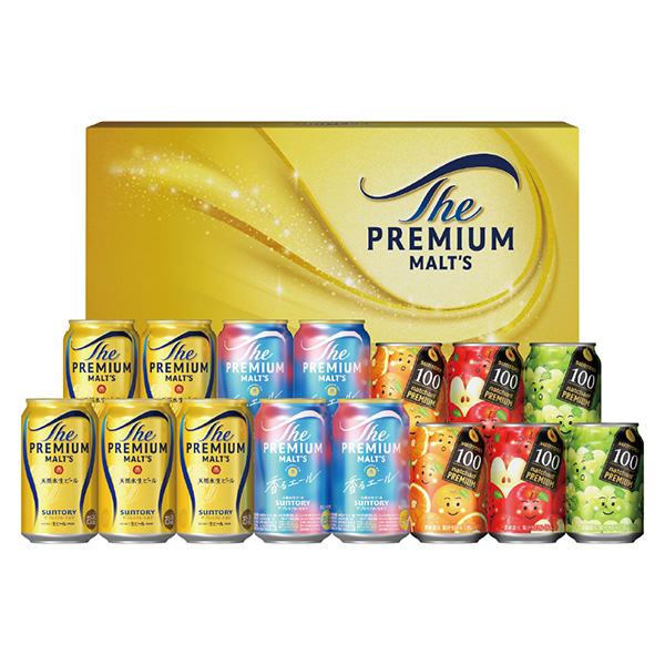ザ・プレミアム・モルツ(350ml缶×5、香るエール350ml缶×4)、なっちゃん100(オレンジ290g缶・りんご290g缶・白ぶどう290g缶×各2)