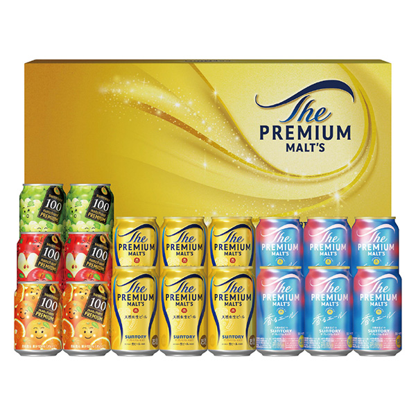 ザ・プレミアム・モルツ(350ml缶・香るエール350ml缶×各6)、なっちゃん100(オレンジ290g缶・りんご290g缶・白ぶどう290g缶×各2)