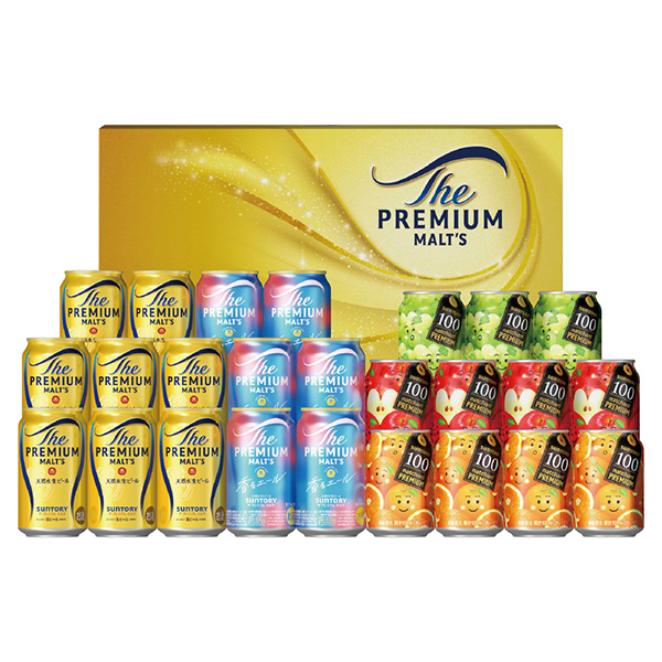 ザ・プレミアム・モルツ(350ml缶×8、香るエール350ml缶×6)、なっちゃん100(オレンジ290g缶・りんご290g缶×各4、白ぶどう290g缶×3)