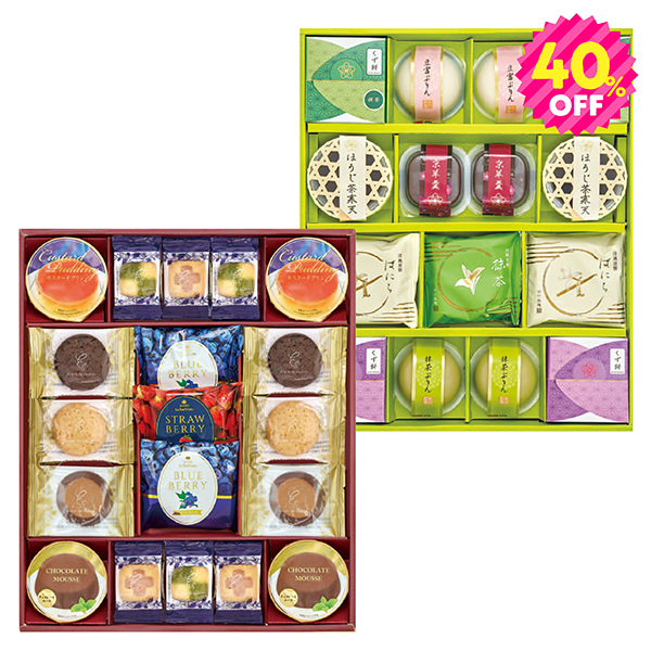 カスタードプリン75g×2、チョコムース75g×2、モザイククッキー(バニラ&イチゴ×6・バニラ&抹茶×6・チョコ&ブルーベリー×4)、クッキー(チョコチップ・ココナッツ)×各4、ヴァッフェル(ブルーベリー×2・ストロベリー)、ほうじ茶寒天72g×2、くず餅(黒みつ付)72g×2、くず餅抹茶(黒みつ付)72g×2、京羊羹64g×2、ぷりん(抹茶・豆富)各64g×各2、洋風煎餅(ばにら×4・抹茶×2)