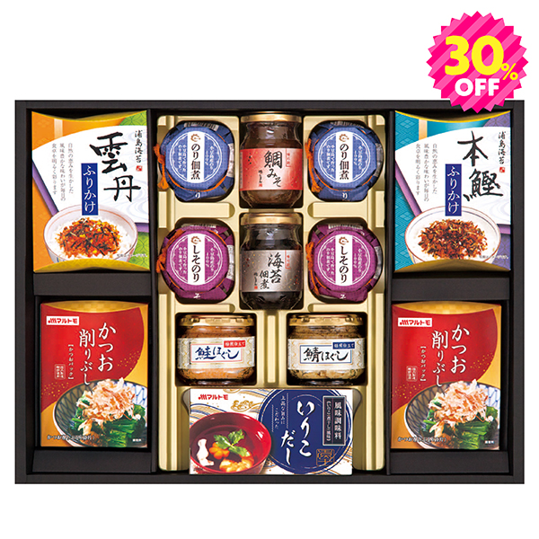 磯じまん(海苔佃煮90g・鯛みそ100g)、小豆島産佃煮(のり・しそのり)各80g×各2、鯖ほぐし40g、鮭ほぐし40g、マルトモ(いりこだし8g×5P・かつお削りぶし1.5g×4P×2)、浦島海苔ふりかけ(本鰹・雲丹)各3.8g×各4袋