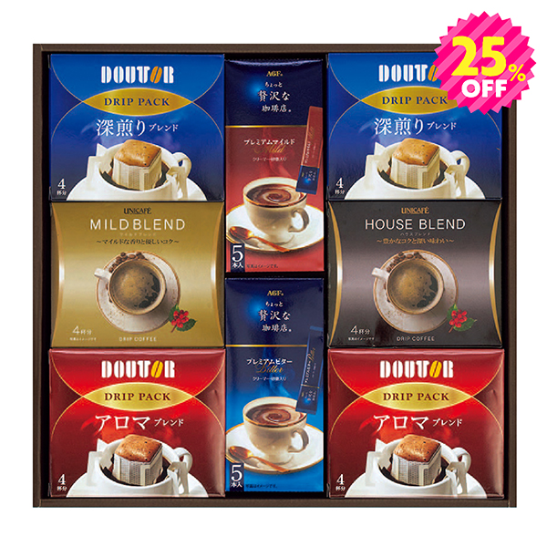 ドトールドリップパック(深煎りブレンド・アロマブレンド)各7g×各4P×各2、ちょっと贅沢な珈琲店スティックコーヒー(プレミアムマイルド・プレミアムビター)各7g×各5P、ユニカフェドリップコーヒー(ハウスブレンド・マイルドブレンド)各7g×各4P