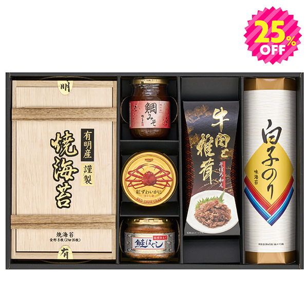 柳川海苔本舗有明産焼海苔(2切8枚×2袋)、白子のり味海苔(8切5枚×8袋)、磯じまん鯛みそ100g、牛肉と椎茸のそぼろ和え55g、宝幸紅ずわいがにほぐし身55g、鮭ほぐし40g