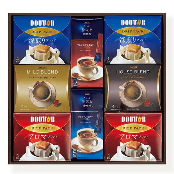 ドトールドリップパック(深煎りブレンド・アロマブレンド)各7g×各4P×各2、ちょっと贅沢な珈琲店スティックコーヒー(プレミアムマイルド・プレミアムビター)各7g×各5P、ユニカフェドリップコーヒー(ハウスブレンド・マイルドブレンド)各7g×各4P