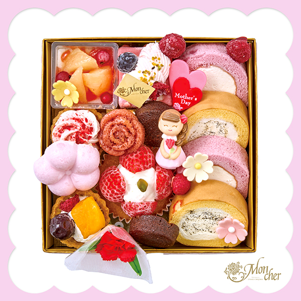 ミニロール(バニラ・ベリー)×各2、フィナンシェショコラミニ×2、ムースピスタチオルージュ、桃プリン、ベリークリームタルト、梅ロッシェ、フルーツタルト、ストロベリーケーキ、ミニバラのフィナンシェ(フランボワーズ)、スマイルママ(砂糖菓子)、母の日ダブルハート(ハート型チョコ菓子)、お花型チョコ(ピンク・白・黄)、果実(フランボワーズ×5・ブルーベリー)、造花(カーネーションピック)