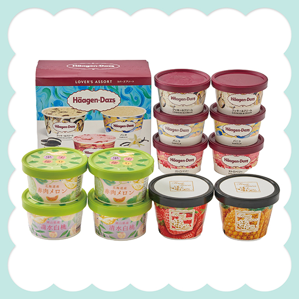 ハーゲンダッツラバーズアソート(バニラ・ストロベリー・クッキー&クリーム)各70ml×各2、フルーツティアラソルベ(イチゴ・パインアップル)各108ml、国産フルーツアイス(北海道メロン・清水白桃)各70ml×各2