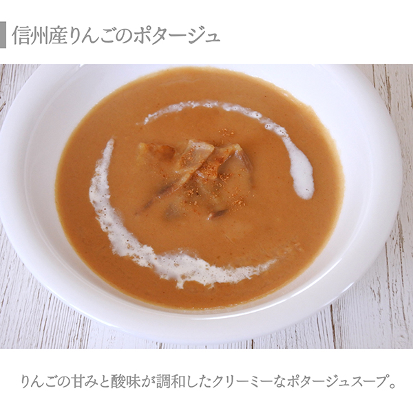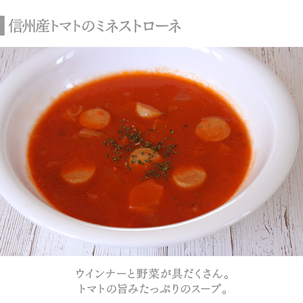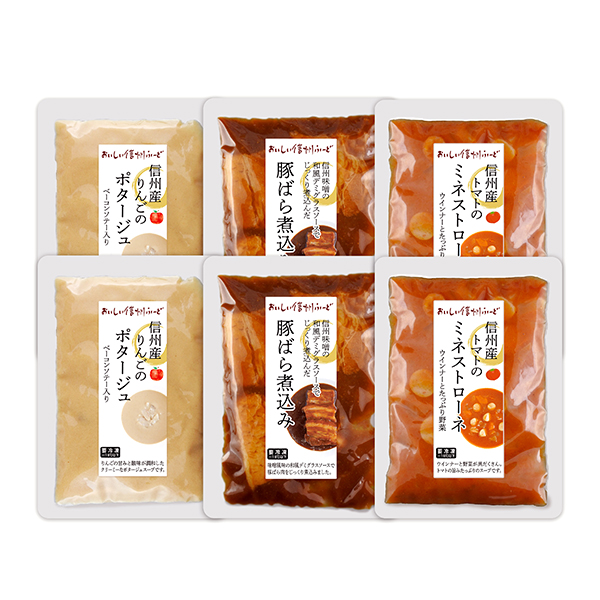 信州産リンゴのポタージュ150g×2・信州産トマトのミネストローネ160g×2・信州味噌の和風デミグラスソースでじっくり煮込んだ豚ばら煮込み125g×2